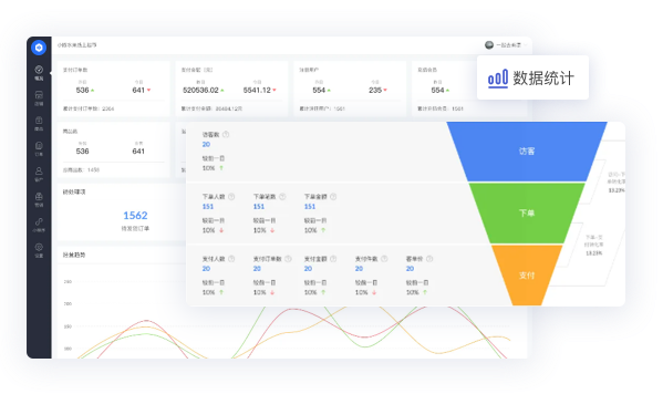內(nèi)置數(shù)據(jù)統(tǒng)計(jì)功能,通過圖/表展示商城各項(xiàng)數(shù)據(jù),支持自由篩選時(shí)間、